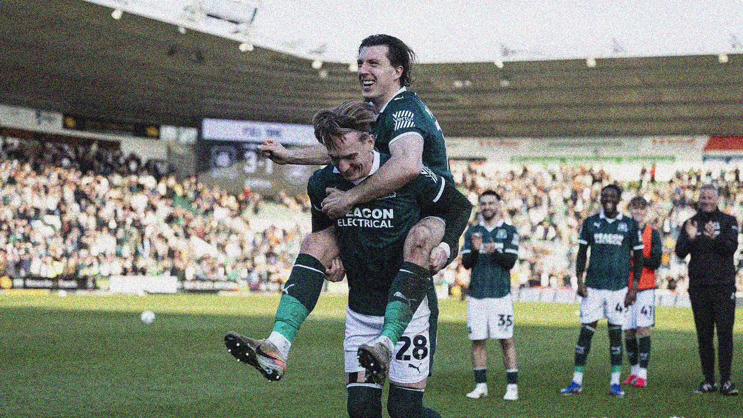 Mitchell and Curtis’ horse antics. Bim parodying Hardie. The season debut (to my ear) of “We’re on our way” and “The Greens are going up” around Home Park was the starter gun on the official play-off push.