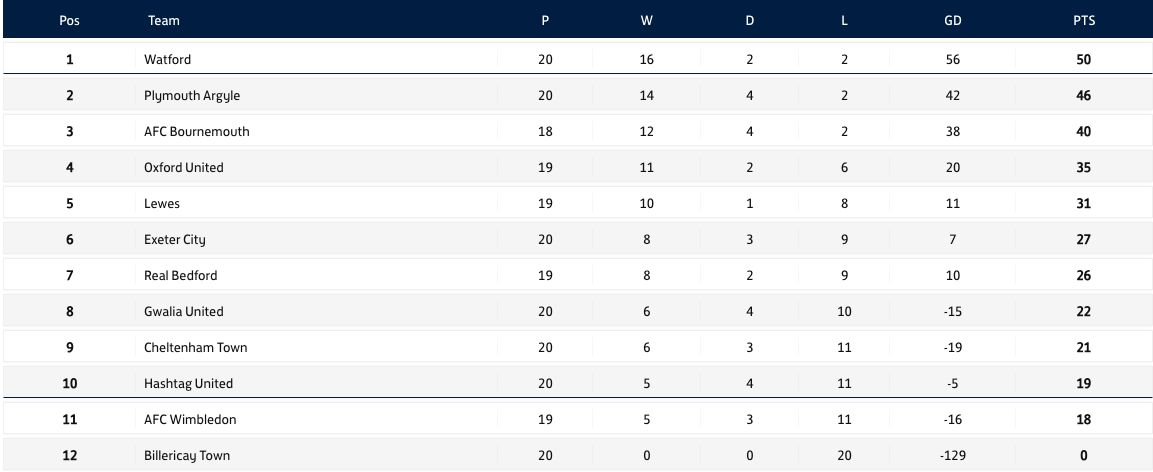 As you can see, the table is really tight, with second place going into a play-off with the Northern division for promotion. Argyle have Oxford (H) and Real Bedford (A), while Bournemouth and Watford face-off on the final day.